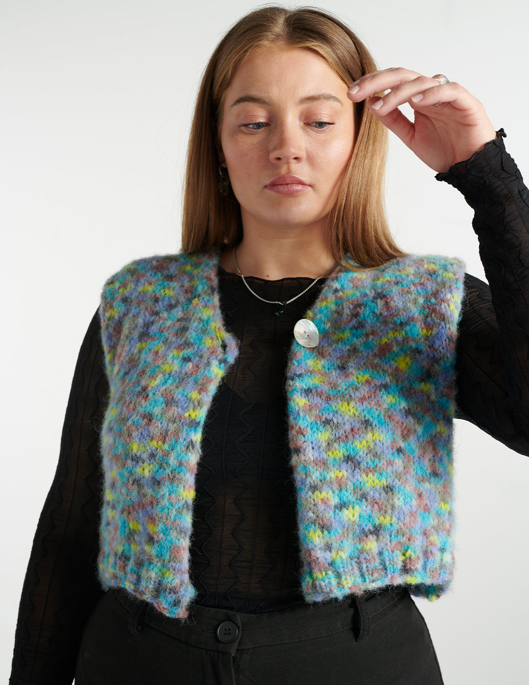 Die verkürzte Länge dieser Weste verleiht dir einen modernen, trendigen Look, der sich perfekt mit High-Waist-Hosen, Röcken oder über langen Hemden kombinieren lässt. Der Cropped-Stil betont die Taille und schafft eine schmeichelhafte Silhouette.