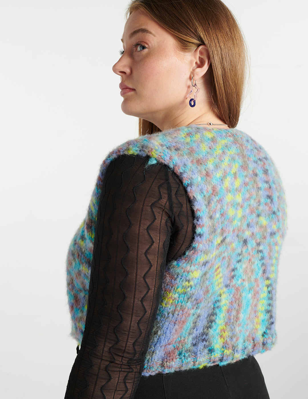Setze ein modisches Statement mit unserer Cropped-Weste aus Alpaka-Wolle. Im lässigen Oversized-Stil gehalten, vereint sie Trendbewusstsein mit gemütlichem Tragekomfort.