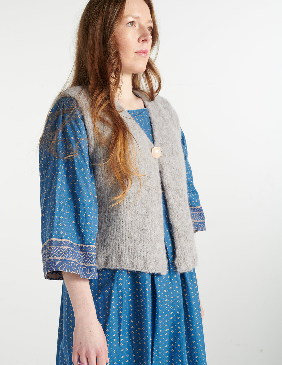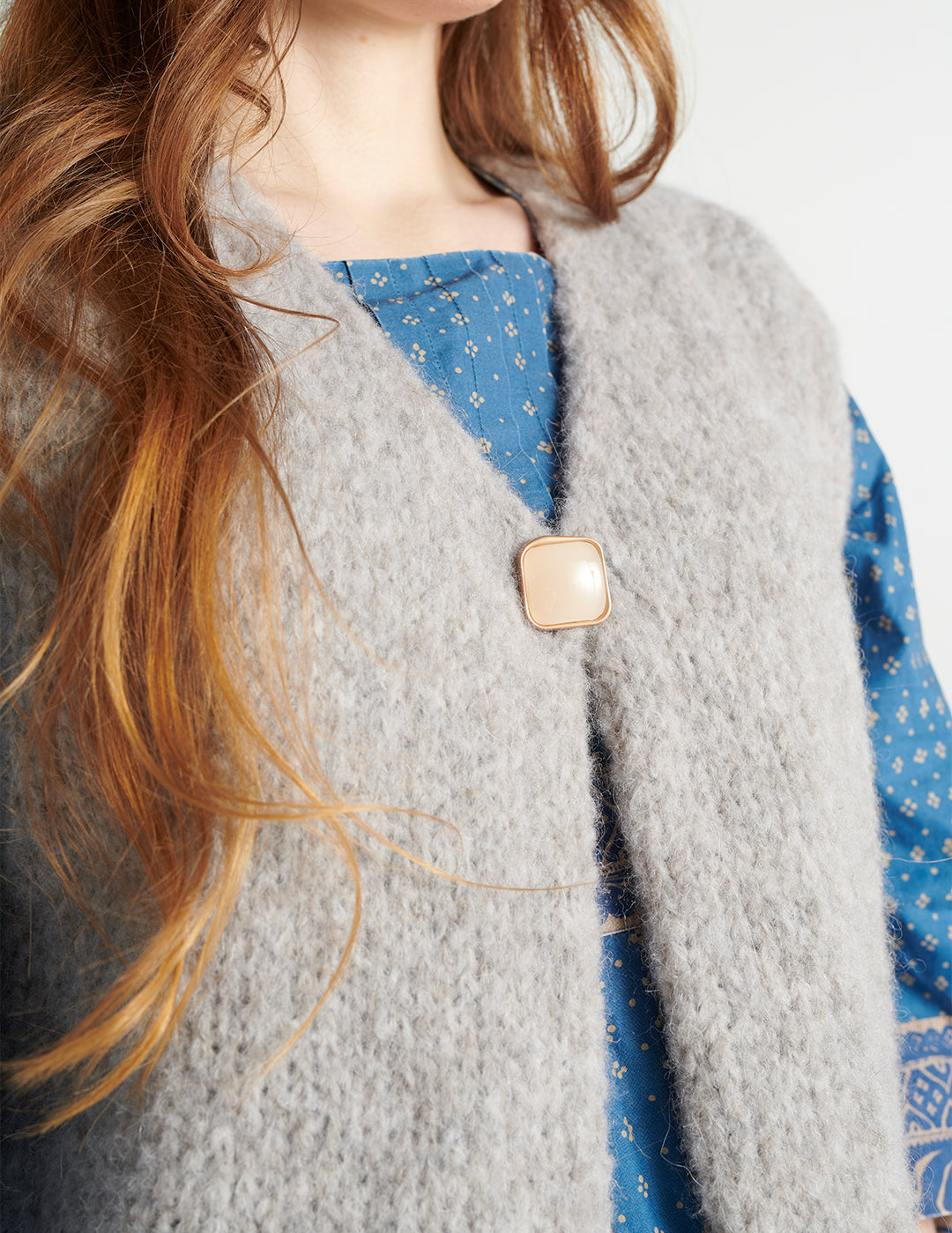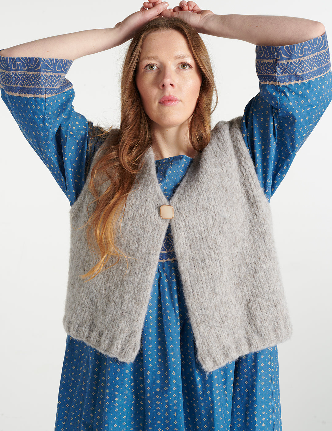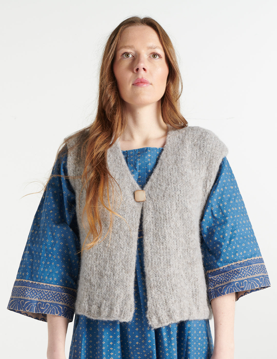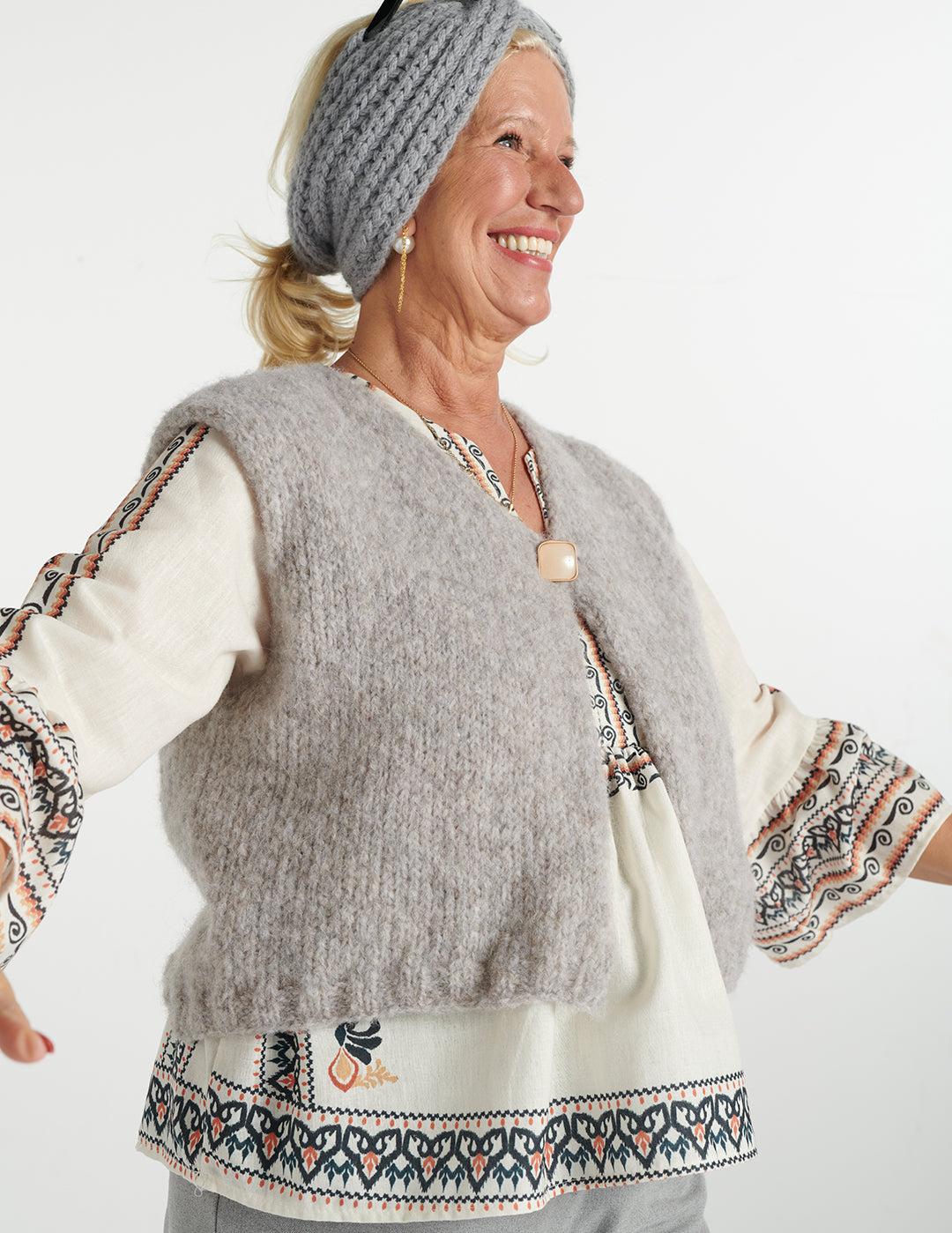 Der leicht oversized Schnitt sorgt für eine lockere Passform, die dich bequem und stilvoll durch den Tag begleitet. Die weiche Alpaka-Wolle fällt sanft und verleiht der Weste eine lässige, mühelose Eleganz.